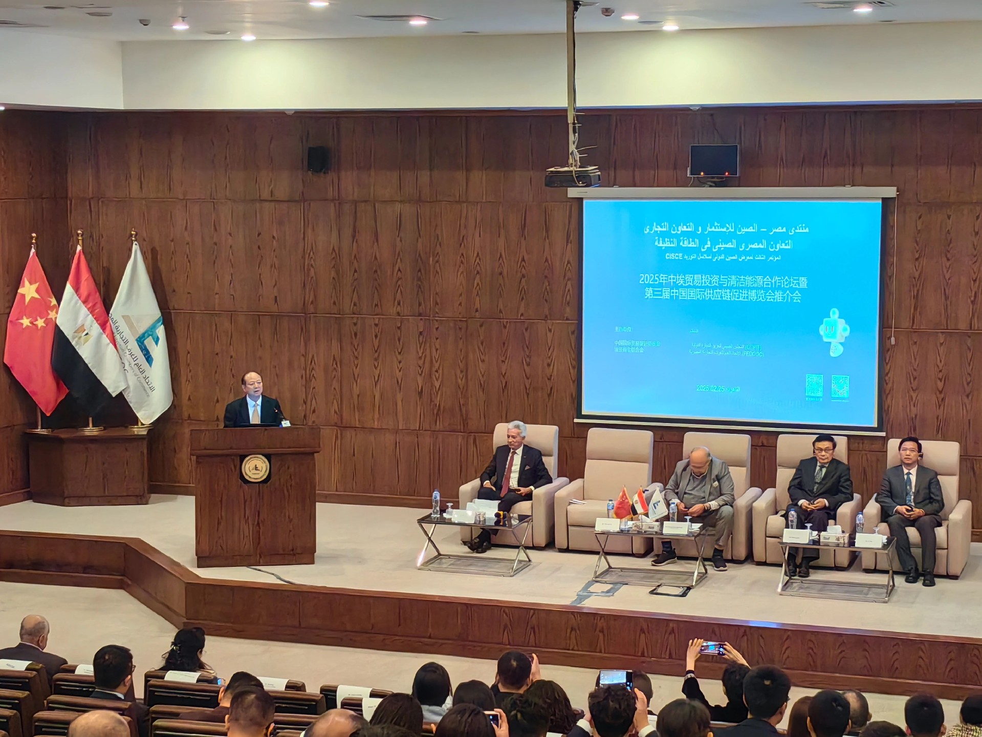 2月25日,2025年中埃贸易投资与清洁能源合作论坛暨第三届链博会推介会在埃及首都开罗举行。中国贸促会副会长陈建安、埃及商会联合会第一副会长哈尼·马哈茂德等出席会议并致辞。中展集团现场推介第三届链博会。中埃两国商协会和企业代表等100余人参加会议。