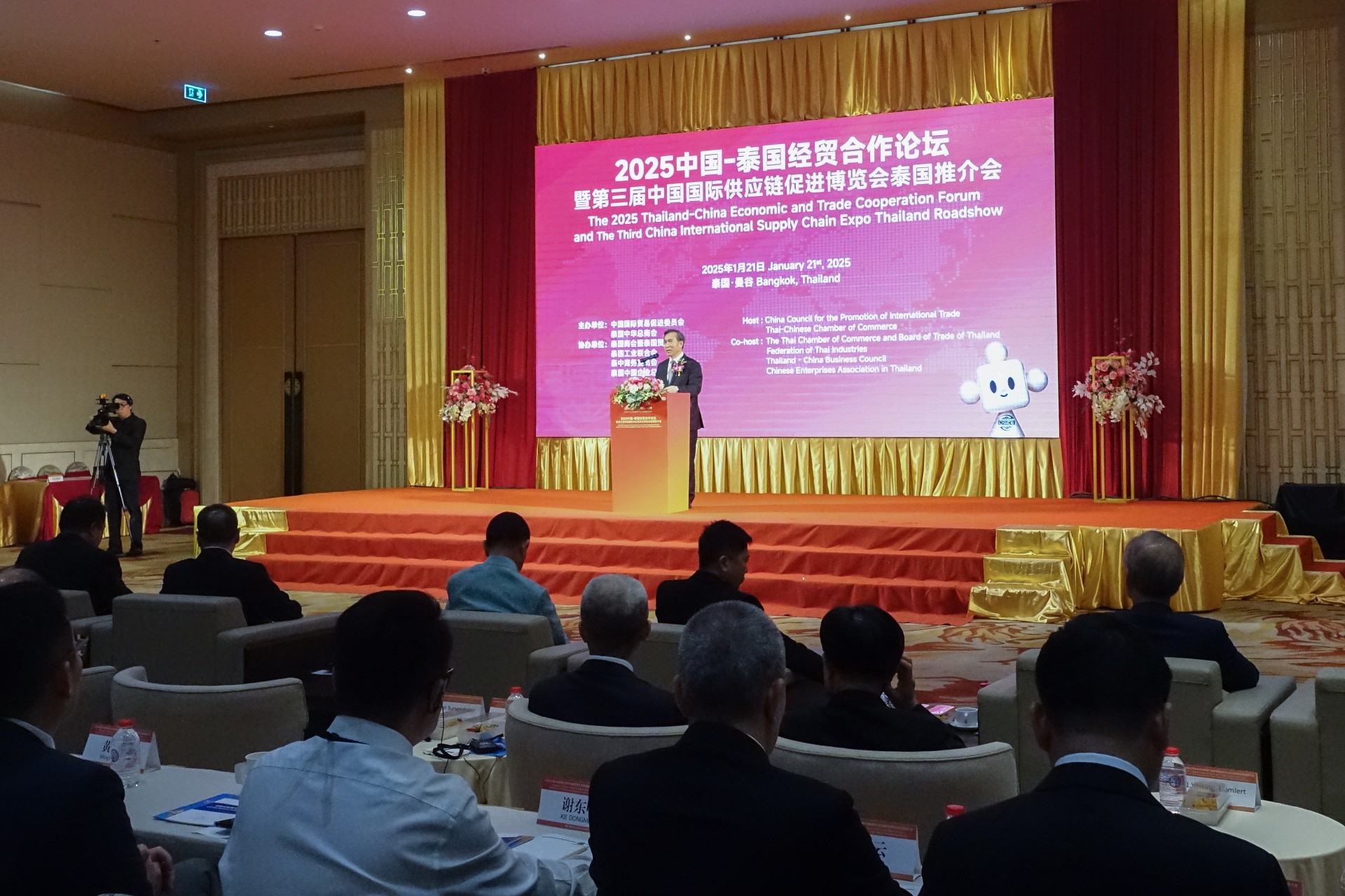 1月21日,由中国贸促会和泰国中华总商会共同主办的中泰经贸合作论坛暨第三届中国国际供应链促进博览会推介会在泰国曼谷成功举行。中国贸促会会长任鸿斌、泰国商业部副部长素察、泰国中华总商会主席林楚钦、泰国正大集团资深董事长谢国民、泰国贸易院主席洪百川、泰国投资促进委员会副秘书长纳鲁查、泰中商务委员会主席邱威功、泰国工业联合会主席张学善以及两国商协会和企业代表等300余人出席会议。中展集团与泰方相关企业和机构现场签署了第三届链博会参展意向书。