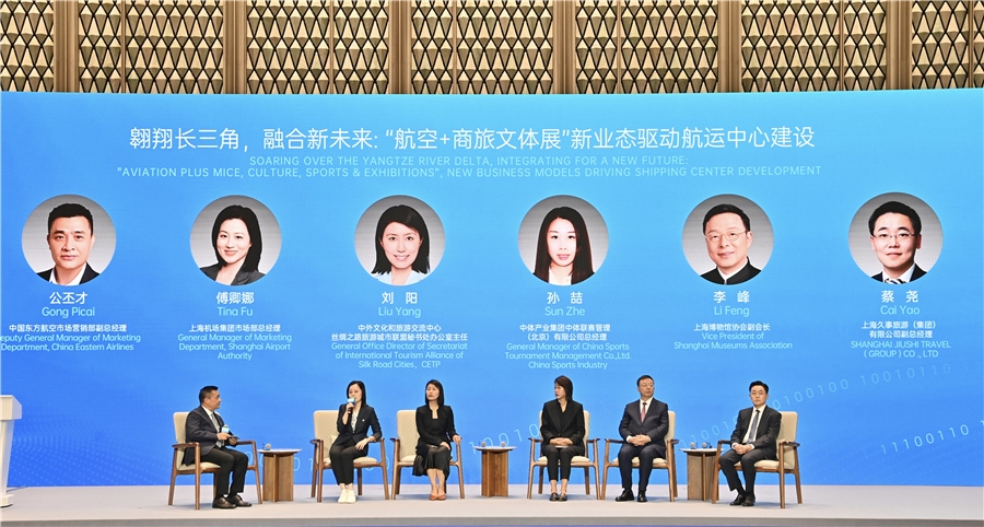 当前,“航空+商旅文体展”构建起“立体服务新生态”。在圆桌论坛环节中,上海机场、中外文化和旅游交流中心、中体产业集团、上海博物馆协会、上海久事集团等单位嘉宾齐聚一堂,以“翱翔长三角,融合新未来:‘航空+商旅文体展’新业态驱动航运中心建设”为主题,共同探讨业态创新实践,为“航空+”融合发展建言献策。