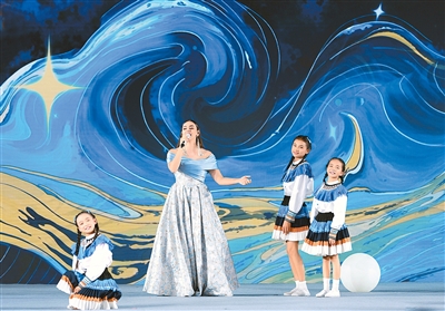 第二届金熊猫国际文化论坛上,大凉山妞妞合唱团、希腊歌手埃里尼(中)和金熊猫少儿艺术团以中英双语演唱歌曲《玉盘》。 图源:央视网